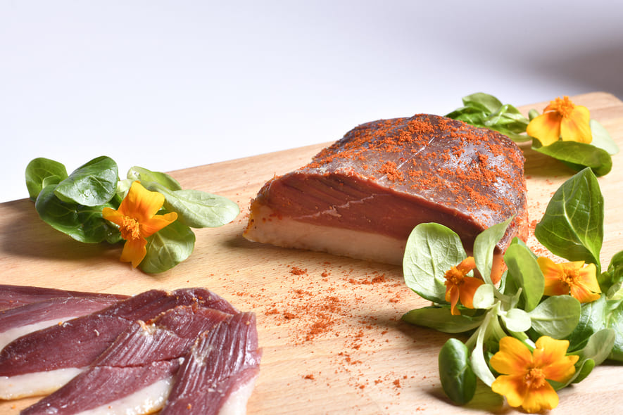 Les magrets de canards gras sont découpés manuellement puis rigoureusement sélectionnés avant d’être assaisonnés au célèbre piment d’Espelette puis séchés durant 20 jours.